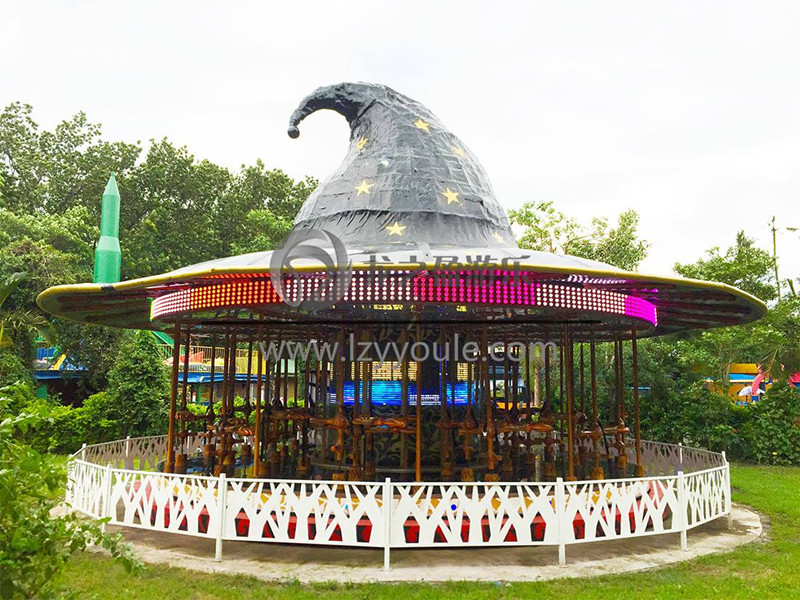飛天魔帽旋轉(zhuǎn)木馬是由許昌龍之盈游樂設(shè)備有限公司制作,世界*一跳脫傳統(tǒng)設(shè)計,結(jié)合全新科技所設(shè)計的身臨其境5D呈現(xiàn)的產(chǎn)品,該產(chǎn)品結(jié)合著名電影《哈利•波特》元素,設(shè)備整體是一個巨型的巫師帽,搭配中央顯示屏,結(jié)合精心華麗的天幕與地景,以及奇幻的煙霧、泡泡等特效,提供白天到黑夜的神奇魔法飛行體驗。伴隨著動人的音樂,飛天魔帽緩緩起動旋轉(zhuǎn)起來,人們坐在哈利波特的魔法掃把上開始自由飛翔,從白天一直飛到黑夜,人們通過3D地景技術(shù)飛過的森林,飛過了山川河流,又飛過了大海,飛遍了世界每一個角落,轉(zhuǎn)動過程中煙霧與泡泡不斷的情景創(chuàng)造,都能夠成功吸引他們消費目光。